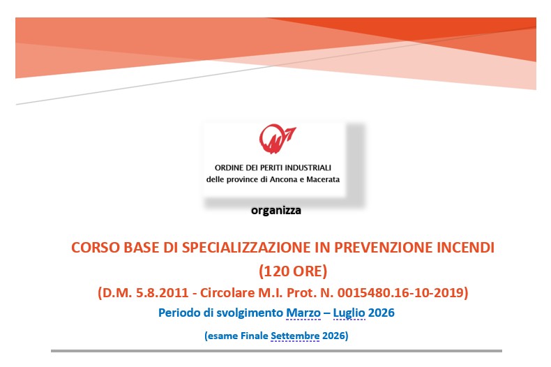 L'Ordine dei Periti Industriali di Ancona e Macerata ha programmato il Corso base di specializzazione in prevenzione incendi (120 ore) in modalita'Â diretta streaming su piattaforma Zoom ed esame in presenza presso la sede dell'Ordine.